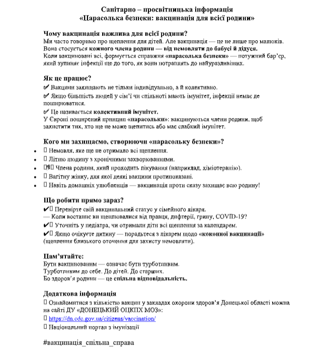 Корисно:ДУ «ДОНЕЦЬКИЙ ОЦКПХ МОЗ» – docphc.dn.uaНаціональний портал з імунізації – vaccine.org.ua
